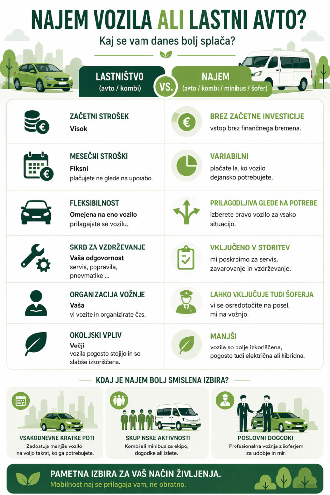 | Vidik | Lastništvo (avto / kombi) | Najem (avto / kombi / minibus / šofer) |