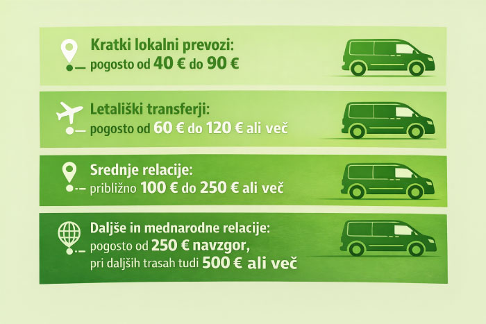 Pri krajših lokalnih prevozih se cena pogosto začne okvirno pri 40 € ali 60 €, pri letaliških transferjih pa je tipičen razpon približno od 60 € navzgor, medtem ko se pri daljših in mednarodnih relacijah cena praviloma oblikuje individualno glede na razdaljo in zahtevnost prevoza. Pri najemu kombija z voznikom se urna logika pogosto uporablja predvsem pri večurnih ali celodnevnih najemih.
